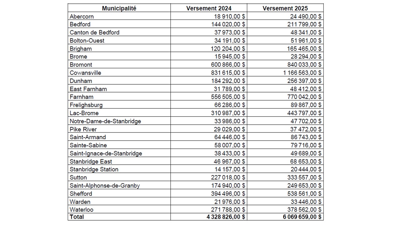 Cowansville, le 18 novembre 2024 – Au nom de la ministre des Affaires municipales, Mme Andrée Laforest, la ministre responsable du Sport, du Loisir et du Plein air et députée de Brome-Missisquoi, Mme Isabelle Charest annonce que les 25 municipalités de Brome-Missisquoi bénéficieront dès l’an prochain de la nouvelle formule de répartition de la croissance d’une partie de la taxe de vente du Québec (TVQ). Pour l’année 2025, ces sommes s’élèveront à 6 069 659 millions de dollars pour la circonscription de Brome-Missisquoi, ce qui représente 1 740 833 millions de dollars de plus que l’année précédente.