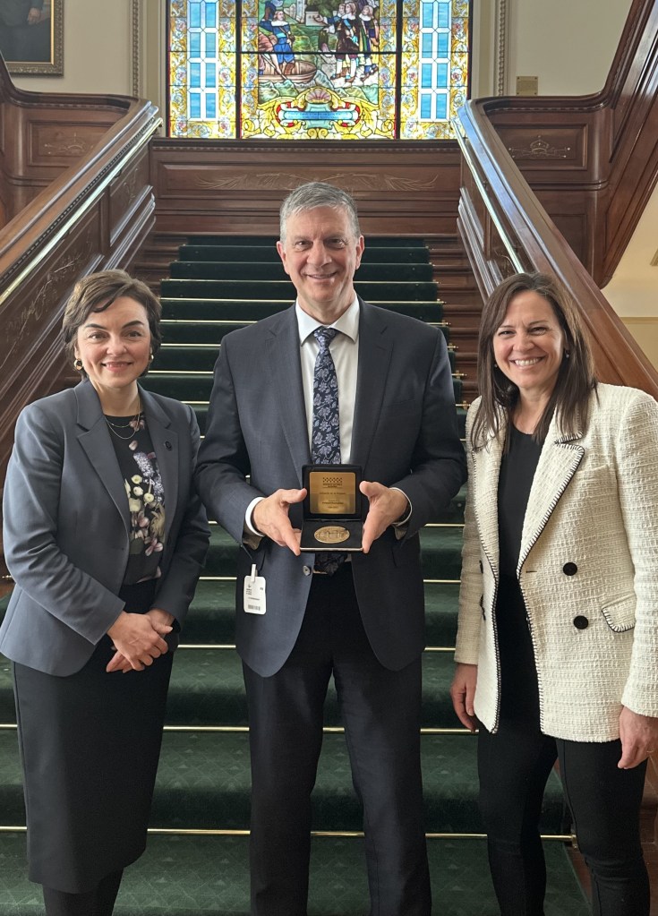 Lors de la période de déclaration des députés au Salon rouge, la députée et ministre Isabelle Charest a mis en lumière l’impressionnante carrière de M. Bourbonnais dans le domaine de la haute technologie. En reconnaissance de ses accomplissements, elle lui a par la suite remis la médaille de la Députée, en présence de membres de sa famille, de plusieurs collègues de travail et de la ministre de l’Économie, de l’Innovation et de l’Énergie, Mme Christine Fréchette.